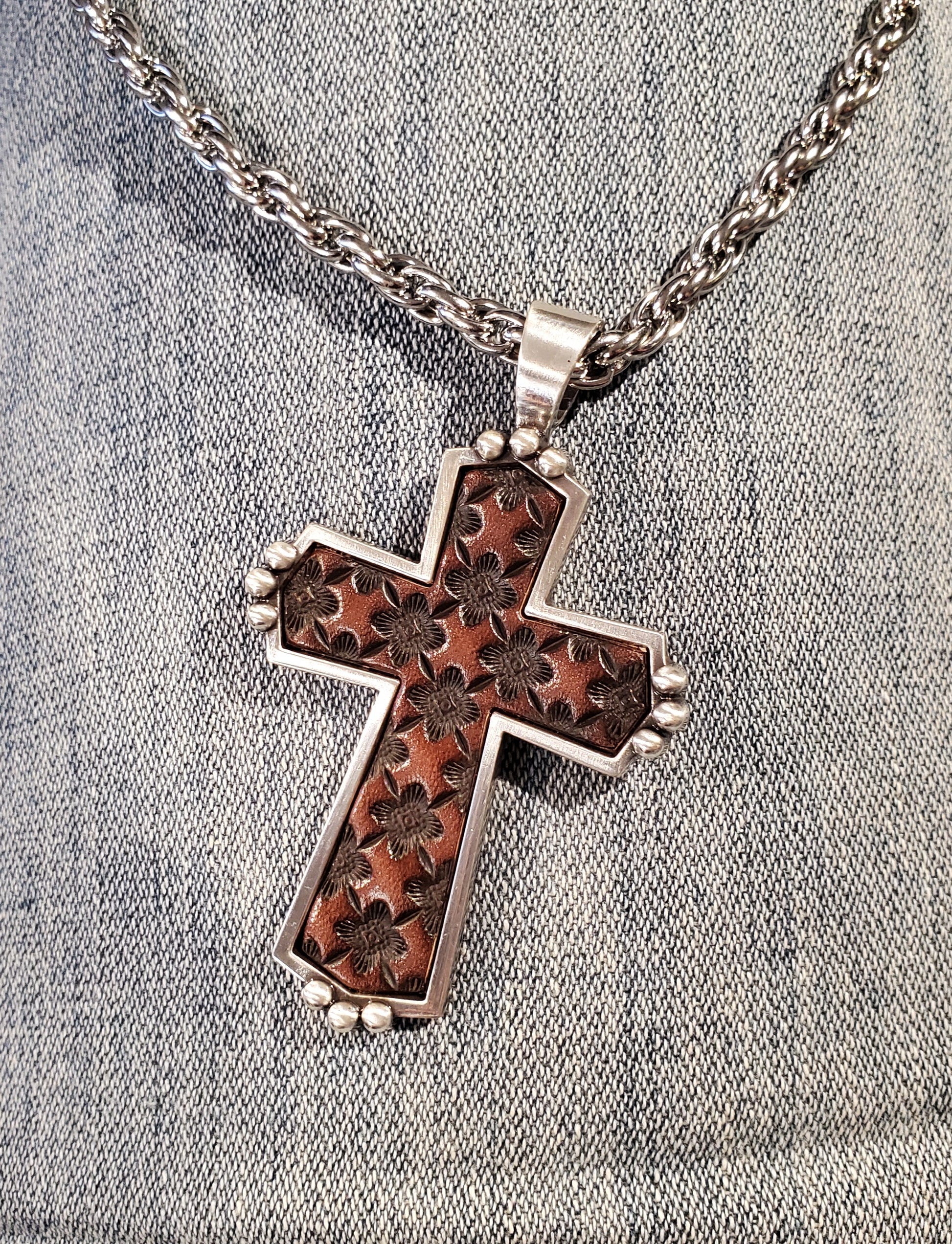 Geo Stamp Leather Inlay Cross Men's Necklace by Silver Strike®